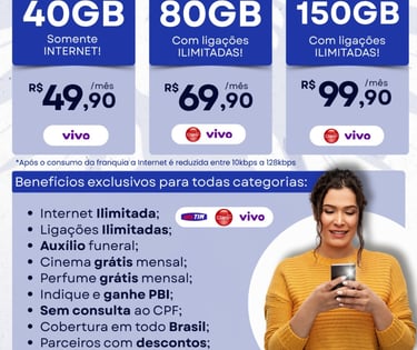 Tenha acesso a 40GB, 80GB ou até 300GB de internet, com ligações ilimitadas e excelente cobertura nacional.