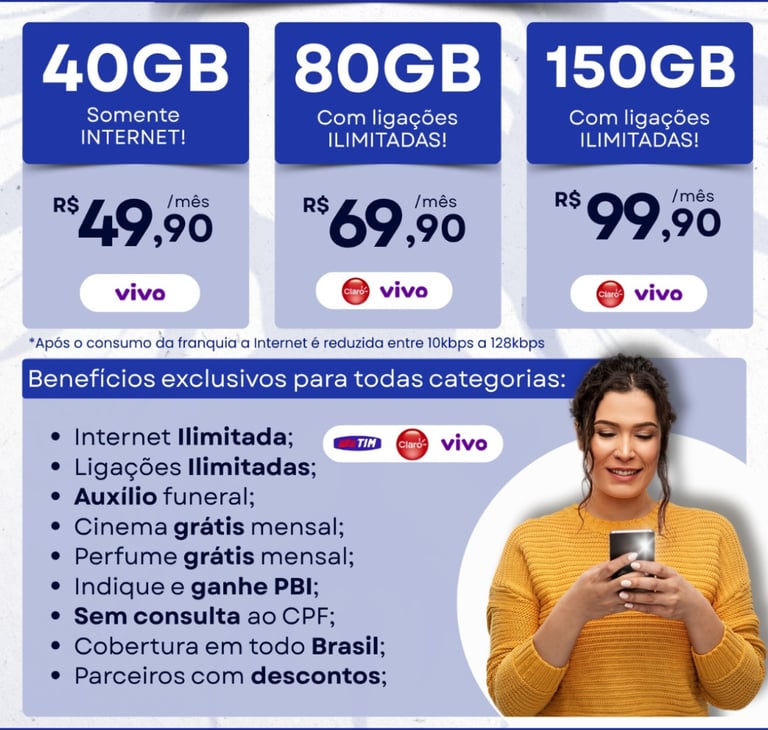 Ideal para quem usa muito o celular, trabalha online, assiste vídeos, usa redes sociais e não quer mais pagar caro por isso.